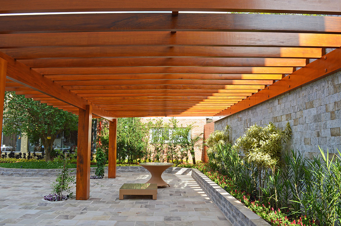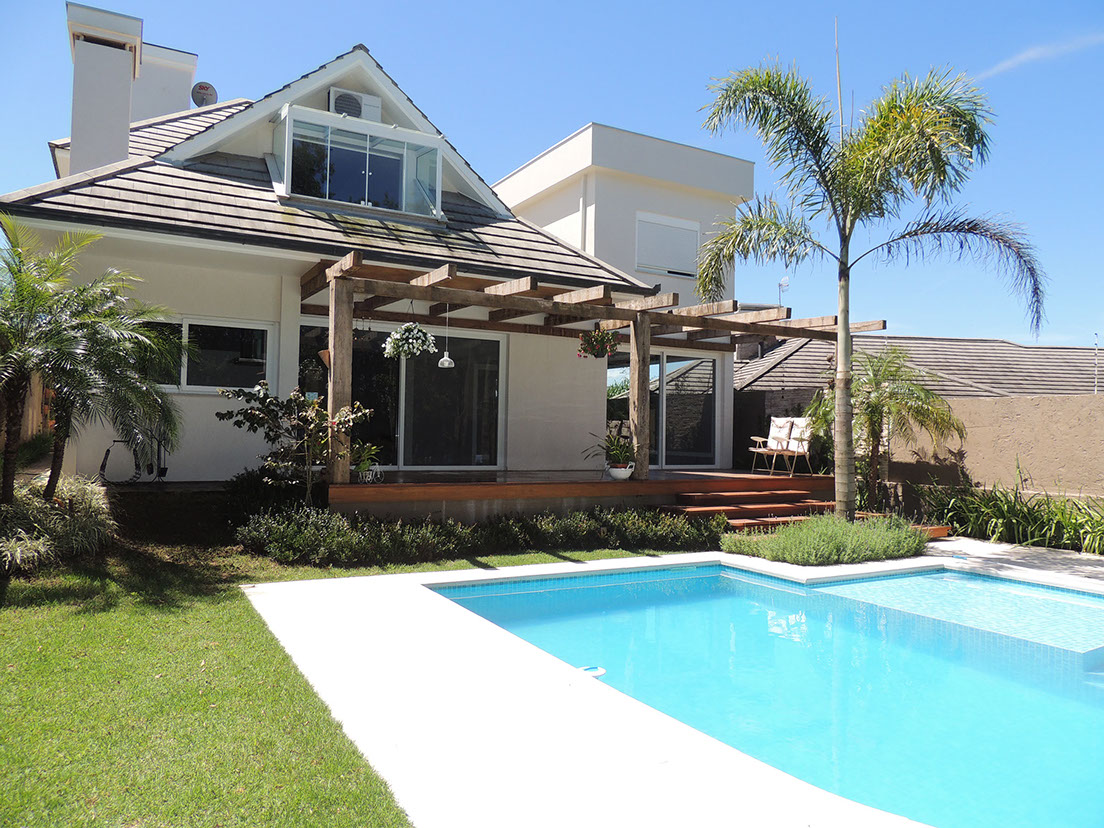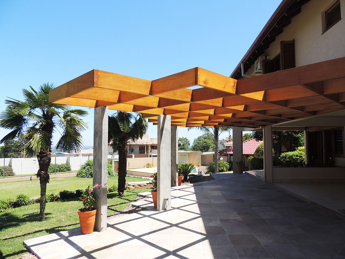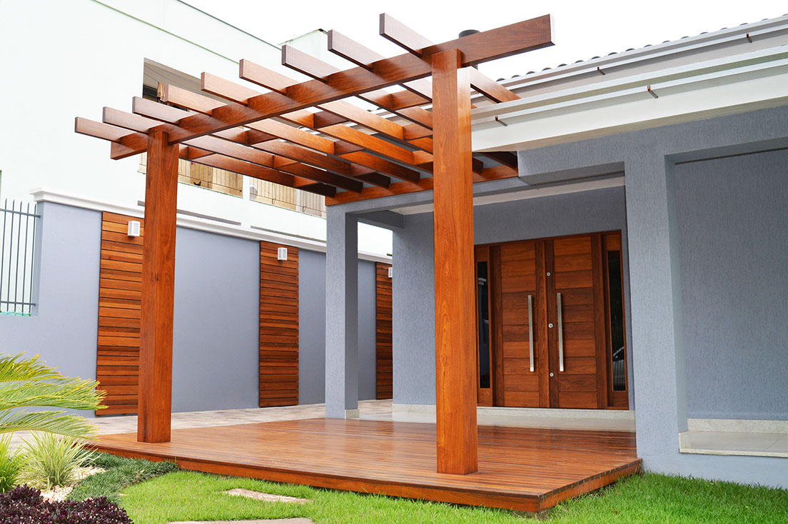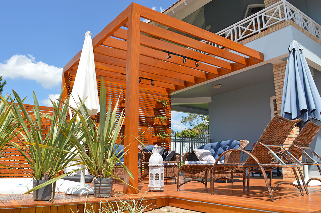 Com estrutura montada a partir de pilares, vigas e caibros de madeiras o pergolado é um lindo elemento decorativo e paisagístico.